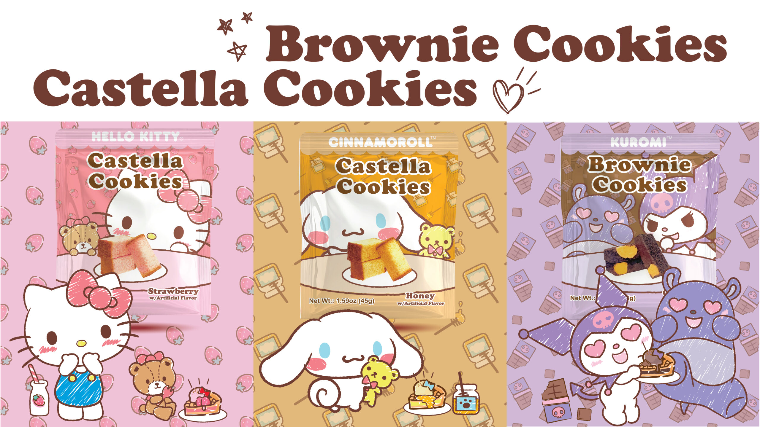 Inspired by classic Japanese castella and indulgent brownie treats, the Castella & Brownie Cookies series delivers a soft, tender texture with a satisfying sweetness. Featuring Hello Kitty and her friends on colorful packaging, these cookies make a comforting and delightful snack for any occasion. Available in Strawberry Castella, Honey Castella, and Chocolate Brownie flavors.
