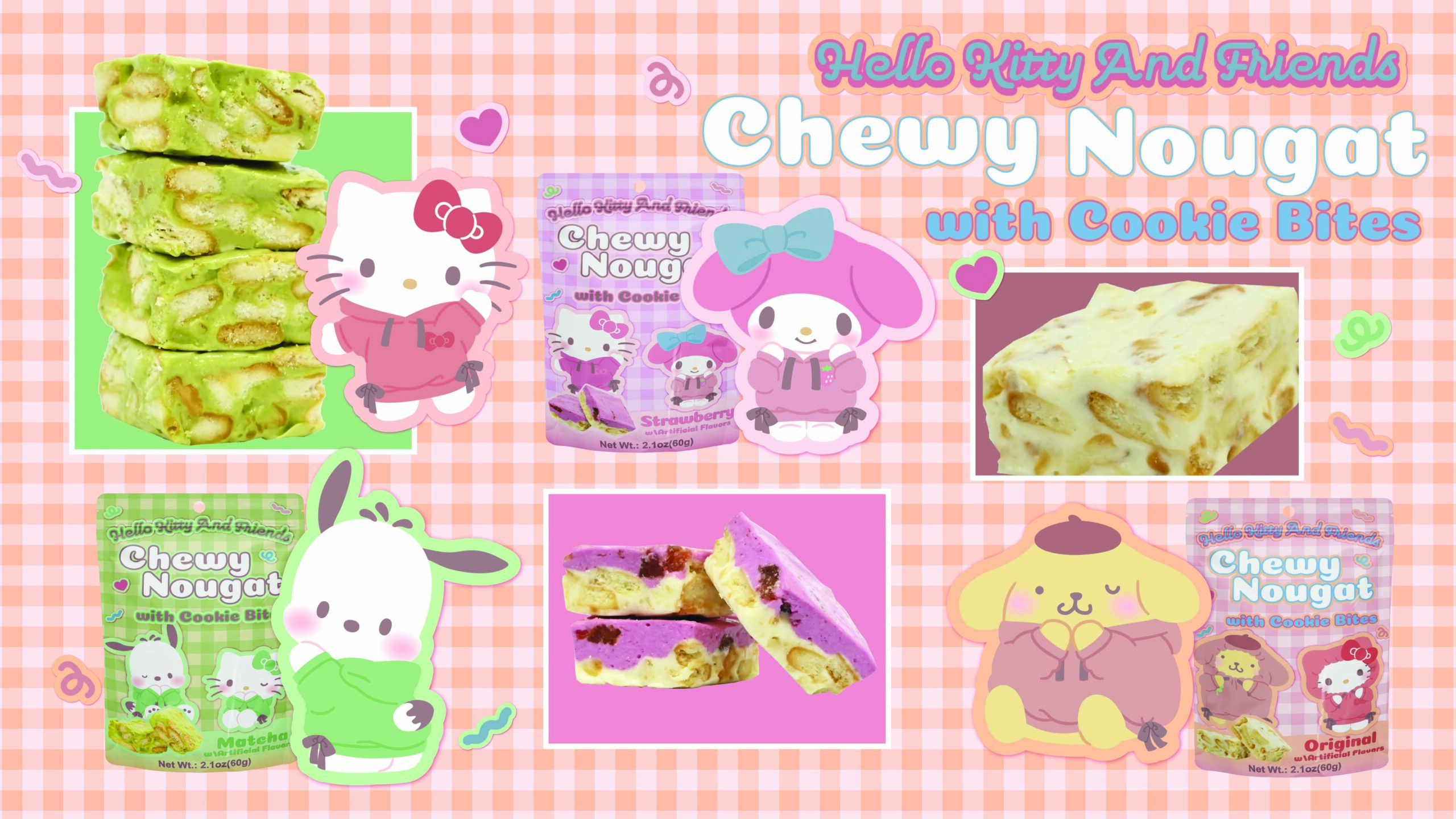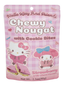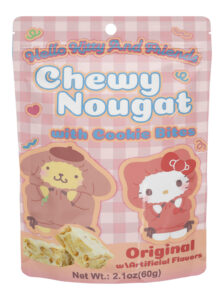 Hello Kitty and Friends Chewy Nougat with Cookie Bites is a delightful treat that combines soft, chewy nougat with crunchy cookie pieces for the perfect balance of texture and flavor.